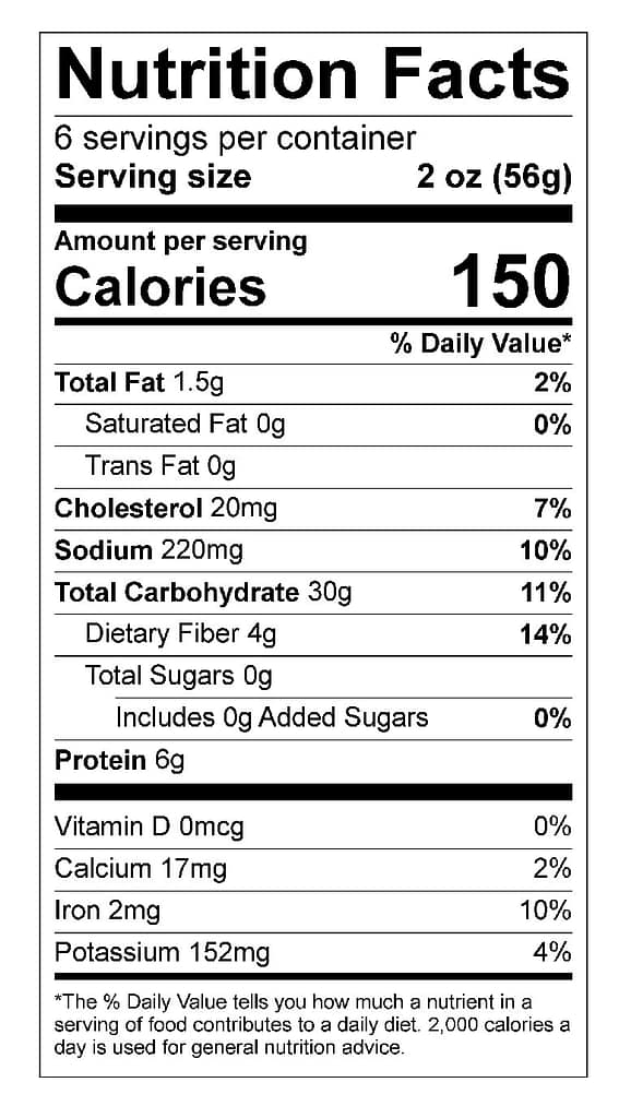 Total Carbohydrates 30g 11%, Dietary Fiber 4g 14%, Total Sugars 0g includes 0g added Sugars 0%